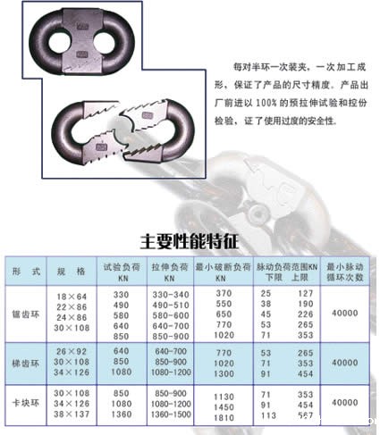 矿用圆环链用开口式连接环22×86 C 试验负荷:415kN。试验负荷下最大伸长率:≤2 ;% ;。最小破断负荷:≥550kN。破断后永久伸长率:≥ 8 ;% ;。脉动负荷范围(kN):下限38 上限190。最小脉动循环次数:40000。